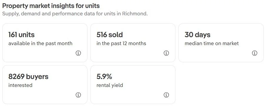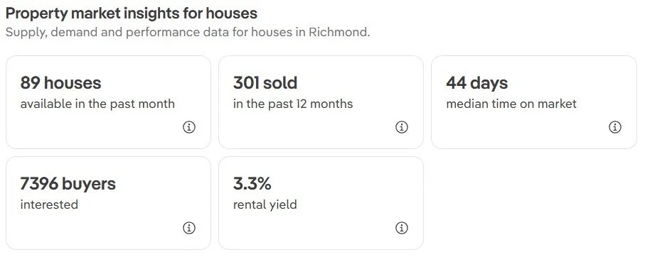 The size of Richmond is approximately 4.4 square kilometres. It has 20 parks covering nearly 4.9% of total area. The population of Richmond in 2016 was 27705 people. By 2021 the population was 28587 showing a population growth of 3.2% in the area during that time. The predominant age group in Richmond is 20-29 years. Households in Richmond are primarily childless couples and are likely to be repaying over $4000 per month on mortgage repayments. In general, people in Richmond work in a professional occupation.In 2021, 43.00% of the homes in Richmond were owner-occupied compared with 40.80% in 2016.